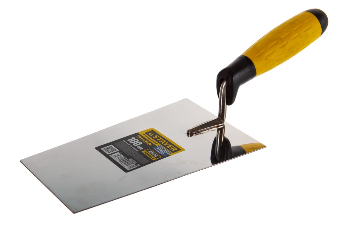 Кельма STAYER ПРОФИ 08291-18 выполнена в форме трапеции размером 180 мм. Такая кельма применяется для перемешивания растворов, кладки кирпича и нанесения штукатурно-отделочных материалов на обрабатываемую поверхность. Длительный срок эксплуатации кельмы достигается за счет полотна, изготовленного из нержавеющей стали и надежному креплению к ней рукояти.