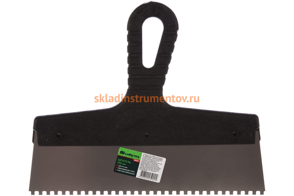 —Шпатель из нержавеющей стали, 250 мм, зуб 4x4 мм, пластмассовая ручка СИБРТЕХ 85457