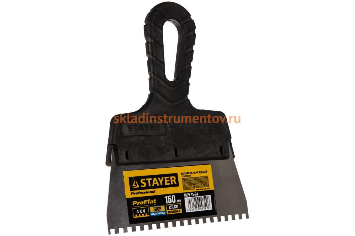Нержавеющий зубчатый шпатель STAYER 1009-15-04 применяется для нанесения и выравнивания различных строительных смесей и растворов. Трапециевидное полотно инструмента изготовлено из нержавеющей стали, что обеспечивает длительный срок службы.