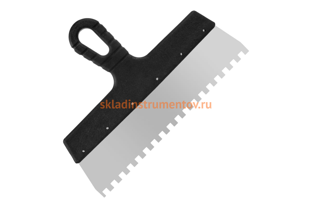 Фасадный зубчатый шпатель (нержавеющая сталь, 300мм, зуб.8x8мм) РемоКолор Мастер 12-8-300 служит для нанесения цементного состава во время укладки кафельной плитки.