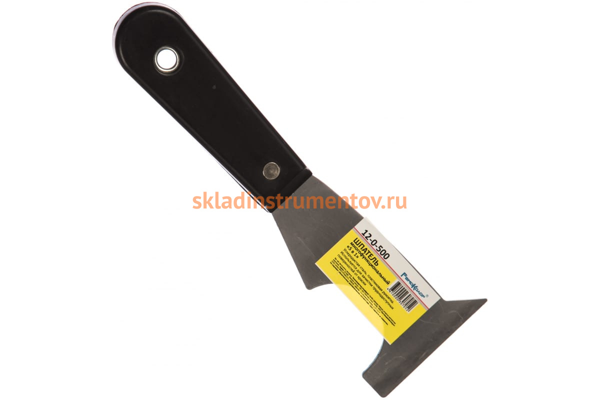 Многофункциональный шпатель 5 в 1 РемоКолор 12-0-500 оснащен полотном из углеродистой стали.