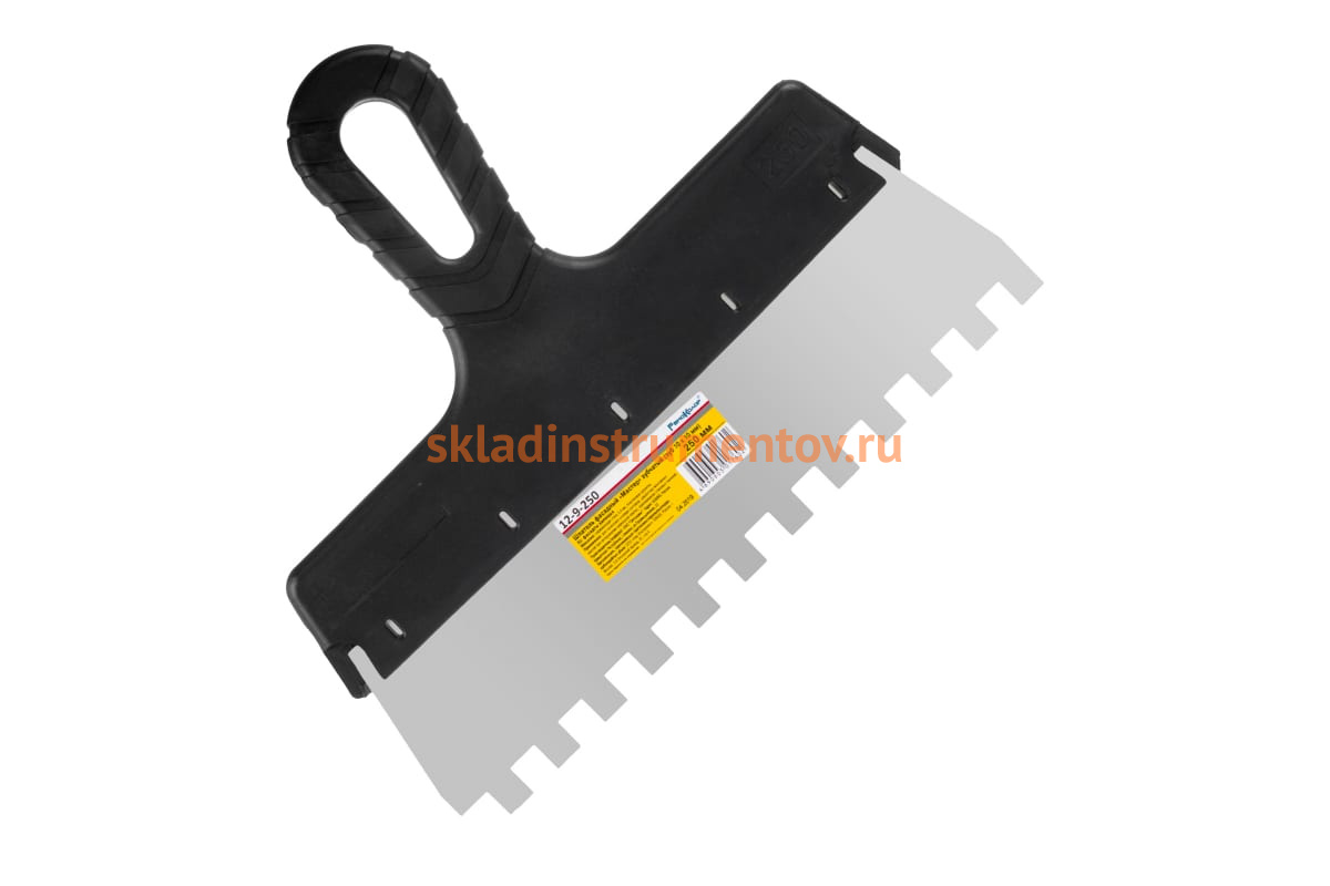 Фасадный зубчатый шпатель (нержавеющая сталь, 250мм, зуб.10x10мм) РемоКолор Мастер 12-9-250 используется для нанесения цементной смеси или специализированного клея.