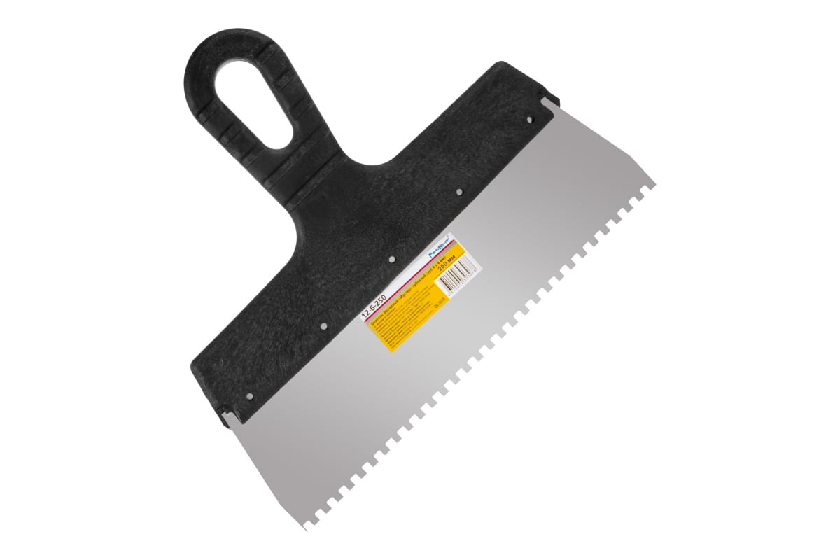 Фасадный зубчатый шпатель (250 мм, зуб.4x4 мм) РемоКолор Мастер 12-6-250 широко используется во время ремонтно-отделочных работ.