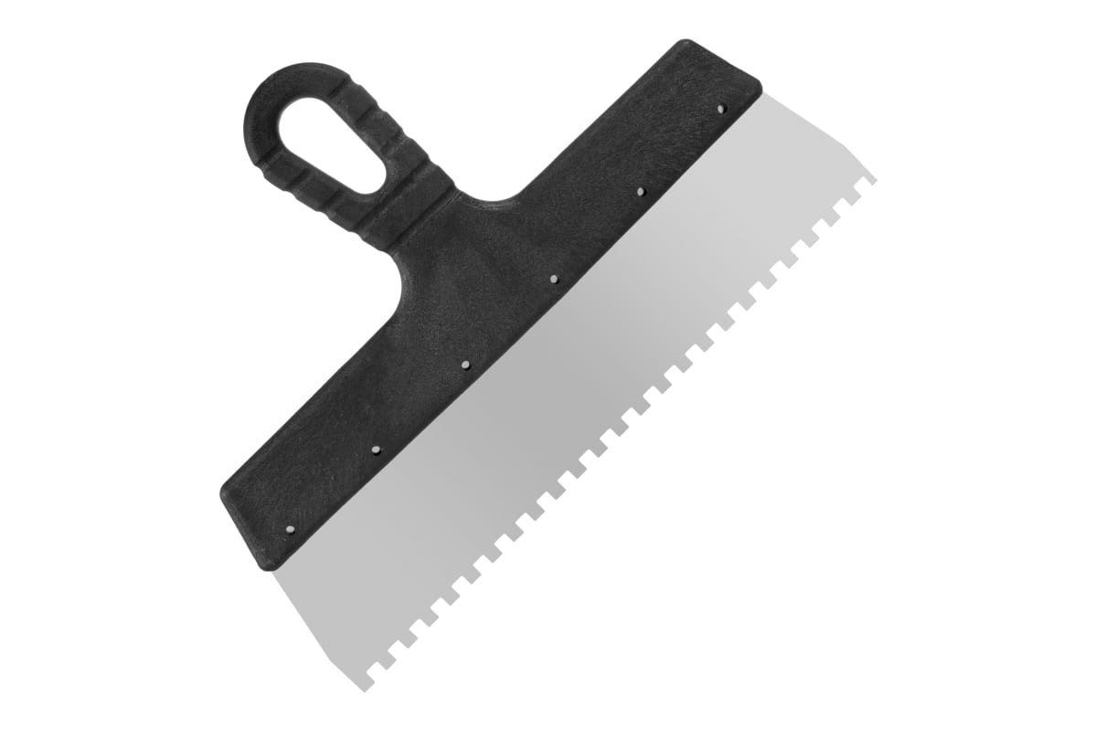 Фасадный зубчатый шпатель (300 мм, зуб.6x6 мм) РемоКолор Мастер 12-7-300 служит для нанесения цементного состава во время укладки кафельной плитки.