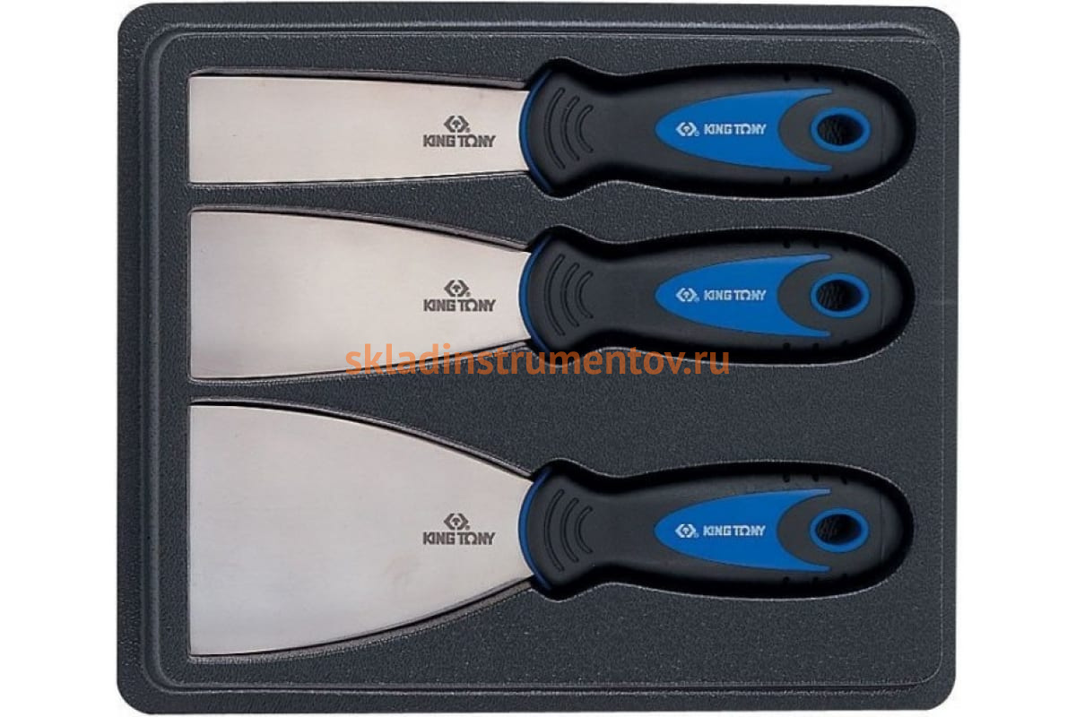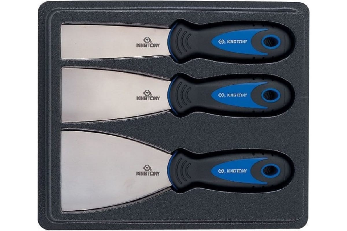 Набор шпателей для кузовных работ 3шт KING TONY 9CJ013 представляет три инструмента различной ширины, которые позволят легко, быстро и профессионально справиться со шпаклевкой кузовных деталей автомобиля при восстановлении вмятин и неровностей. Шпатели оснащены удобными рукоятками из нескользящего двухкомпонентного материала.