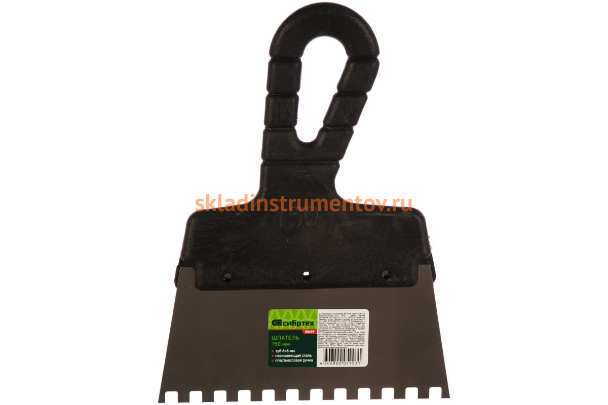 Шпатель из нержавеющей стали,150 мм,зуб 6x6 мм,пластмассовая ручка СИБРТЕХ 85459