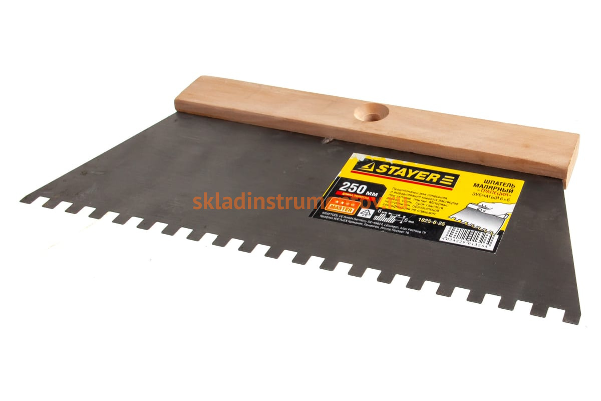 Малярный шпатель, зуб 6х6мм, 250мм STAYER 1025-6-25 является простым в применении приспособлением для нанесения смеси во время малярных работ. Шпатель состоит из стального полотна и деревянной рукоятки. Зубья с шагом 6х6мм позволяют лучше распределить строительную смесь по обрабатываемой поверхности.