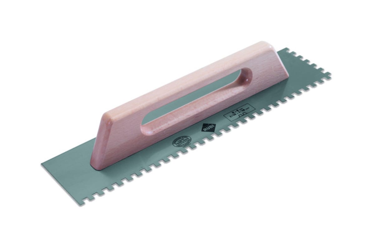 Стальная гребенка RUBI 48см, 10х10мм 65983 представляет собой рабочую пластину из особой прочной стали с антикоррозионной обработкой бесцветным лаком. Идеальная гладкость пластины позволяет выполнять работу быстро и качественно. Зубцы 10х10мм для дозификации клеевого раствора на неровной поверхности.
