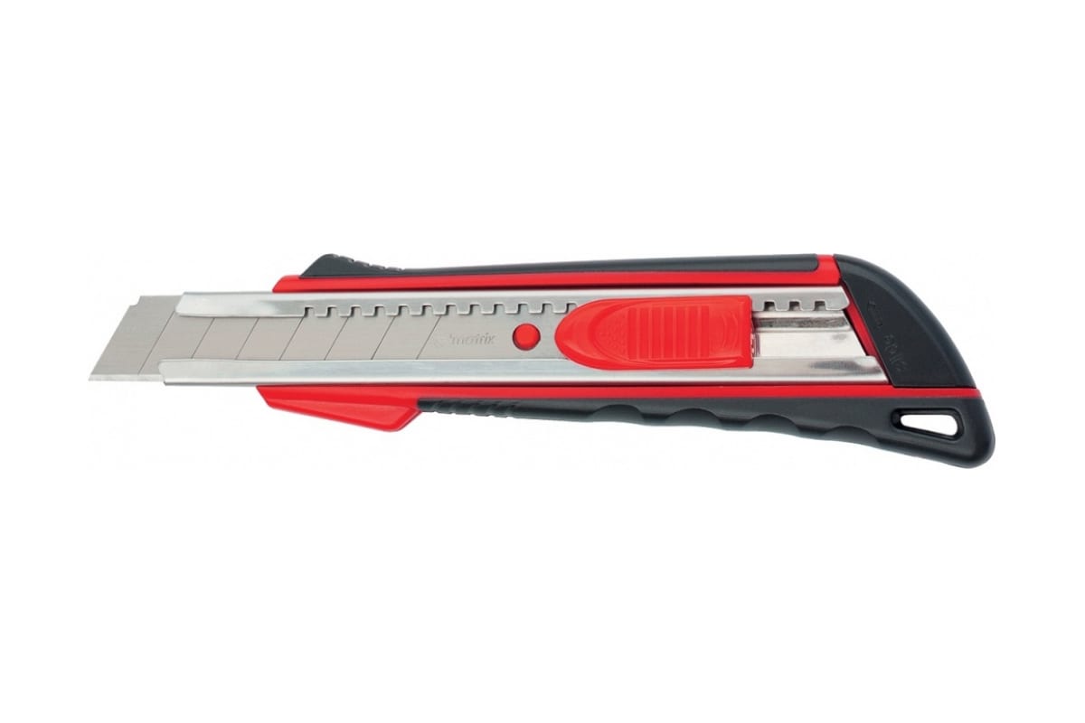 Нож 18мм, выдвижное лезвие, металлическая направляющая, эргономичная двухкомпонентная рукоятка MATRIX 78933 имеет прочную металлическую направляющую и удобную рукоятку, выполненную из сочетания пластика и резины. Старое лезвие легко поддается замене - оно извлекается через хвостовую часть ножа. Для удобного использования предусмотрена автоматическая фиксация лезвия.