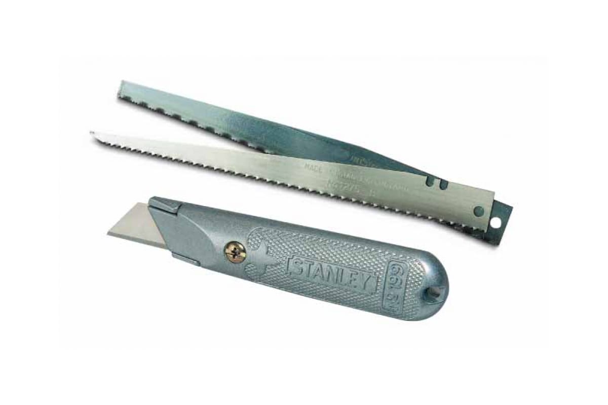 Нож Stanley 0-10-129 обладает компактной металлической конструкцией. Рукоятка инструмента оснащена отверстием для хранения лезвий. В комплект входят два полотна: по дереву и металлу, а также три сменных лезвия - для разрезания картона, обоев, пленки и напольных покрытий. Конструкция носовой части корпуса ножа исключает его деформацию, даже при очень большой боковой нагрузке на лезвие.
