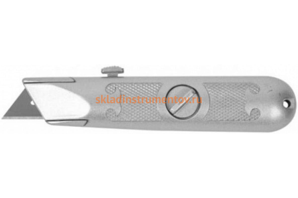 Нож с выдвижным трапециевидным лезвием, тип А24 Зубр МАСТЕР 09220_z01 - универсальный хозяйственный инструмент для бытового использования. Оснащен функцией автоматической фиксации лезвия для более удобного использования. Очень прочен и надежен в эксплуатации. Корпус полностью выполнен из металла. Трапециевидное двустороннее лезвие из стали У8А имеет двойную заточку, оно легко справится с резкой картона, линолеума, ковровых покрытий, гипсокартона, пластика и пр.