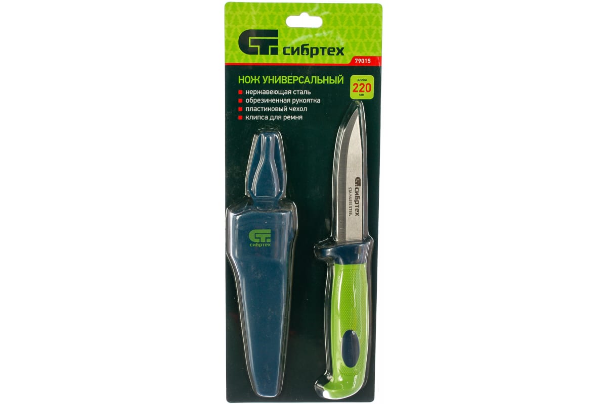 —Универсальный нож с чехлом, обрезиненная рукоятка, 220 мм, лезвие - 100 мм СИБРТЕХ 79015