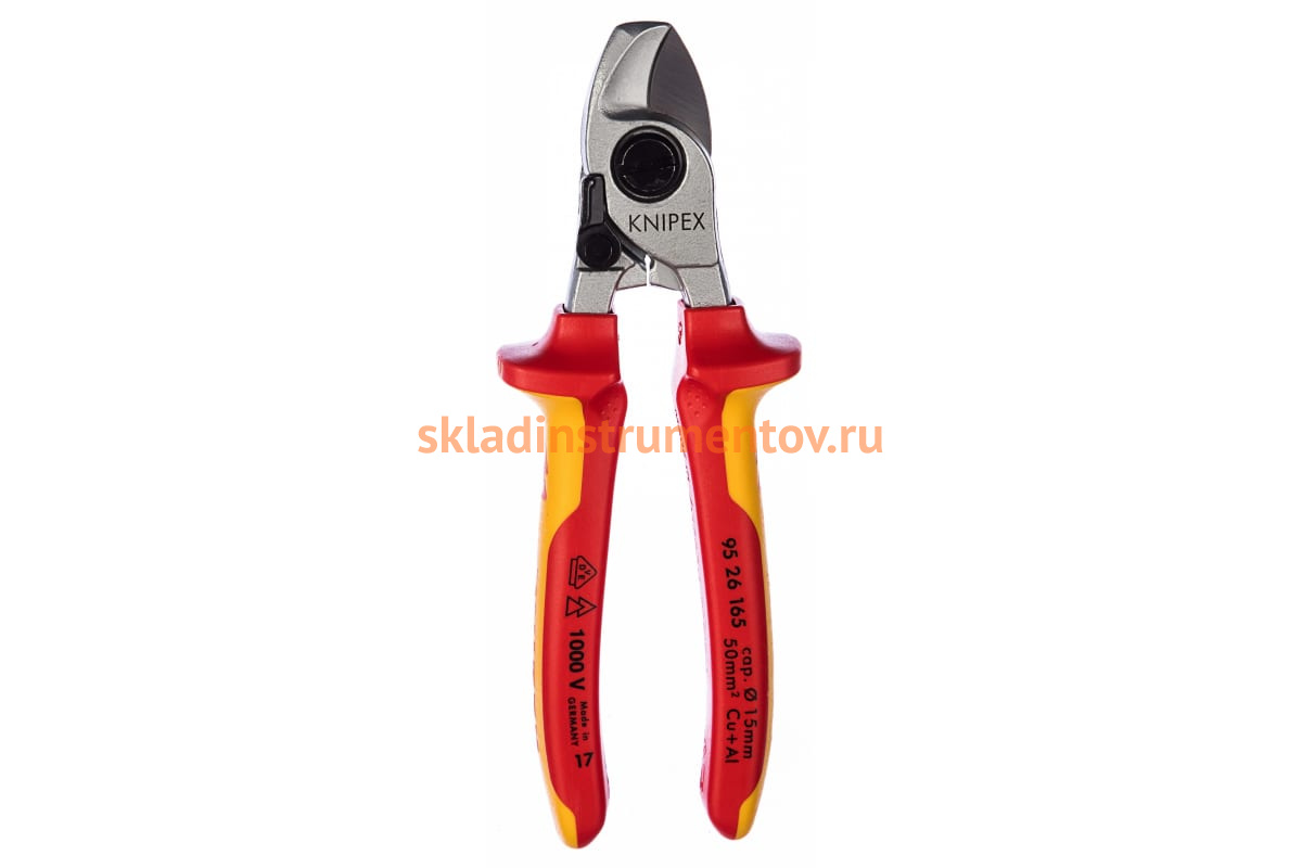 Кабелерез Knipex KN-9526165 предназначен для резки медных и алюминиевых кабелей диаметром 15 мм. Он имеет изолированные рукоятки, что позволяет работать под напряжением до 1000 В. Кабелерез изготовлен из специальной инструментальной стали, закалённой в масле, поэтому имеет долгий срок службы. Изделие сделано в соответствии с DIN EN / IEC 60900.