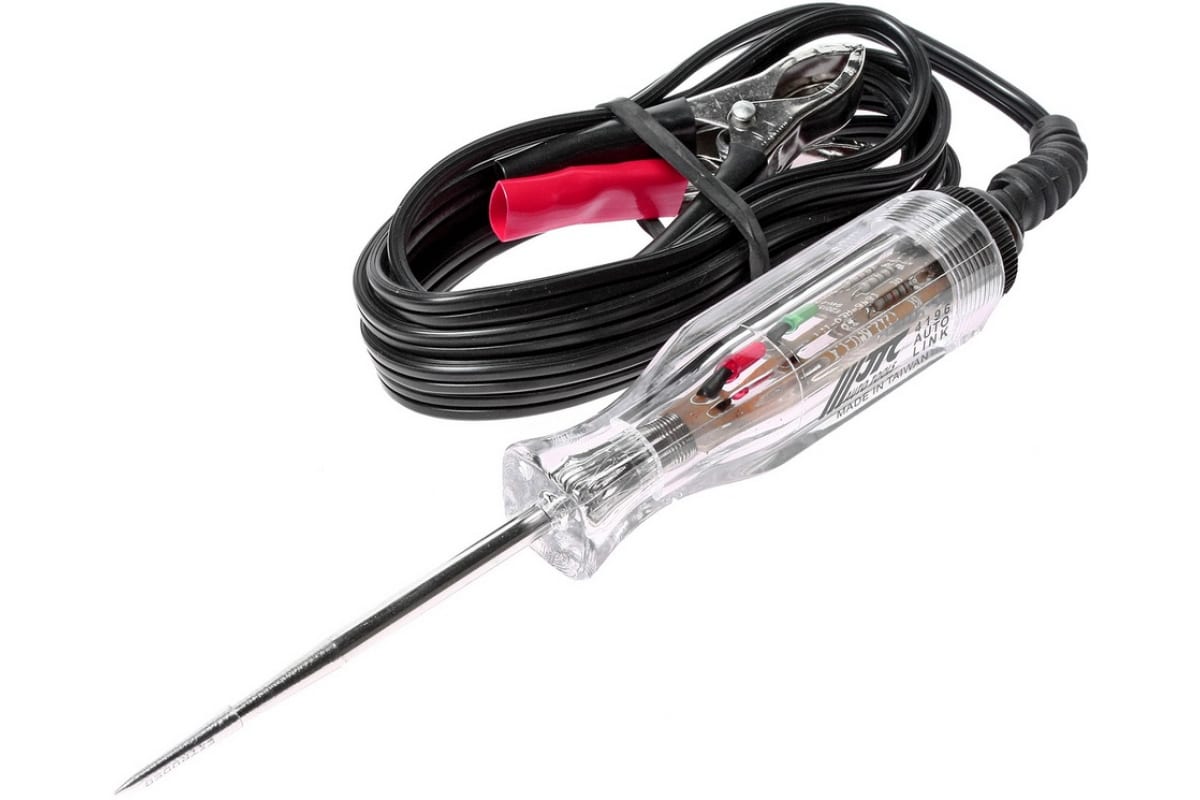 Тестер цепи JTC-4196 представляет собой сочетание усиленного щупа, ударопрочного пластикового корпуса и длинного усиленного кабеля (1.8 м.) с аккумуляторными клипсами и пружинными компенсаторами. Приспособление оснащено двухцветным диодом для легкости визуального определения высокого напряжения (красный свет) и полного его отсутствия (зеленый свет). Пробник служит для применения в цепях с напряжением 6, 12 и 24 В.