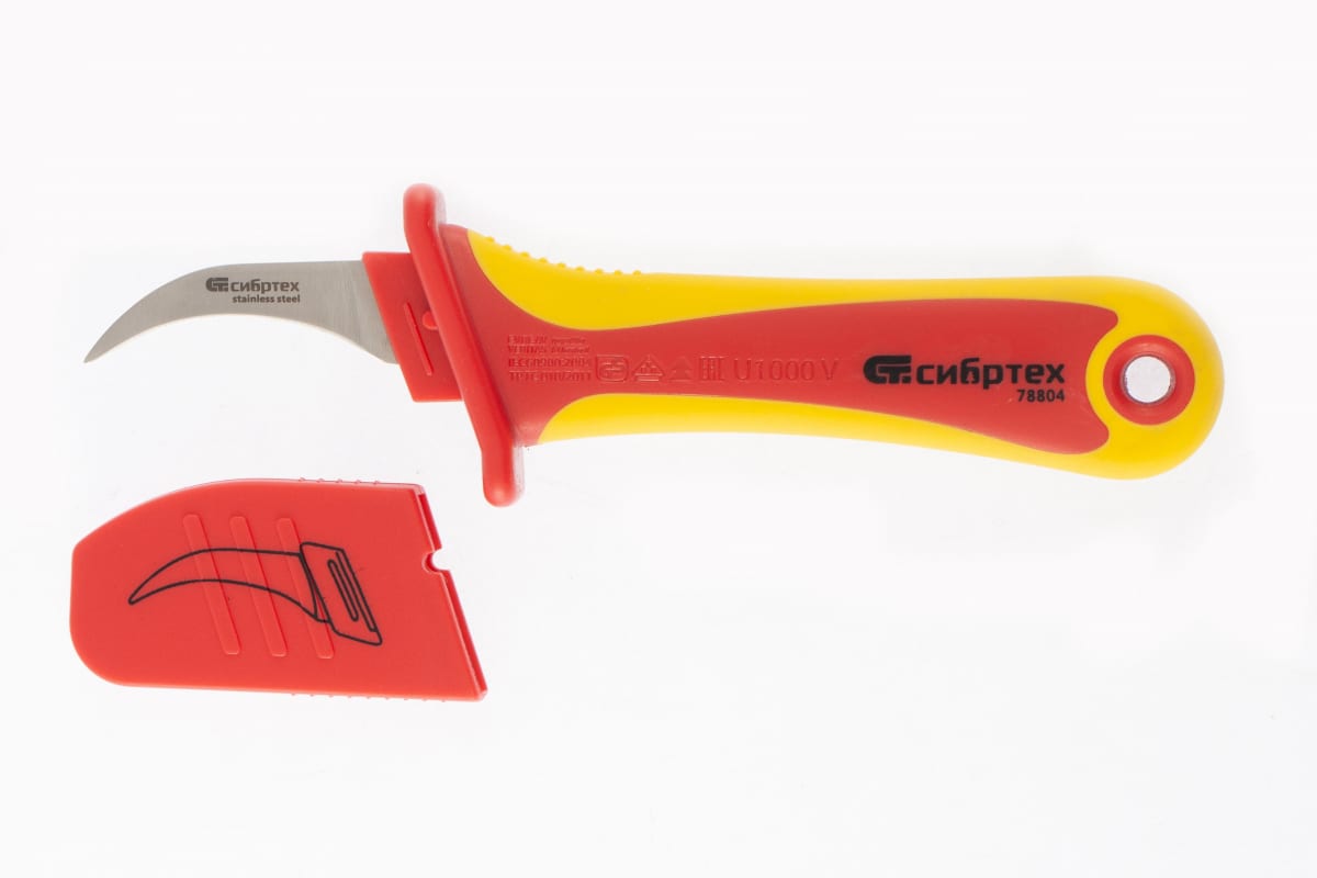 Диэлектрический нож, серповидная рабочая кромка полотна СИБРТЕХ 78804 предназначен для профессионального использования. Применяется для снятия оплетки электрокабелей.
