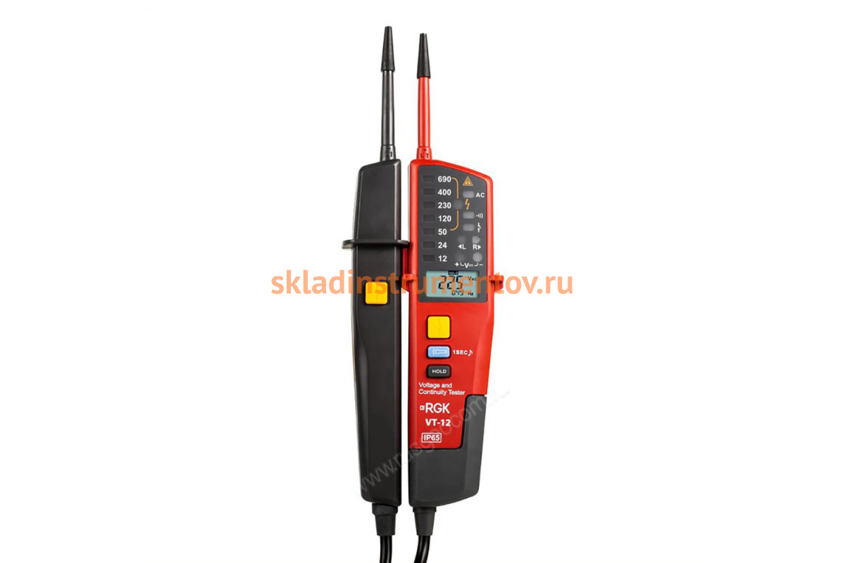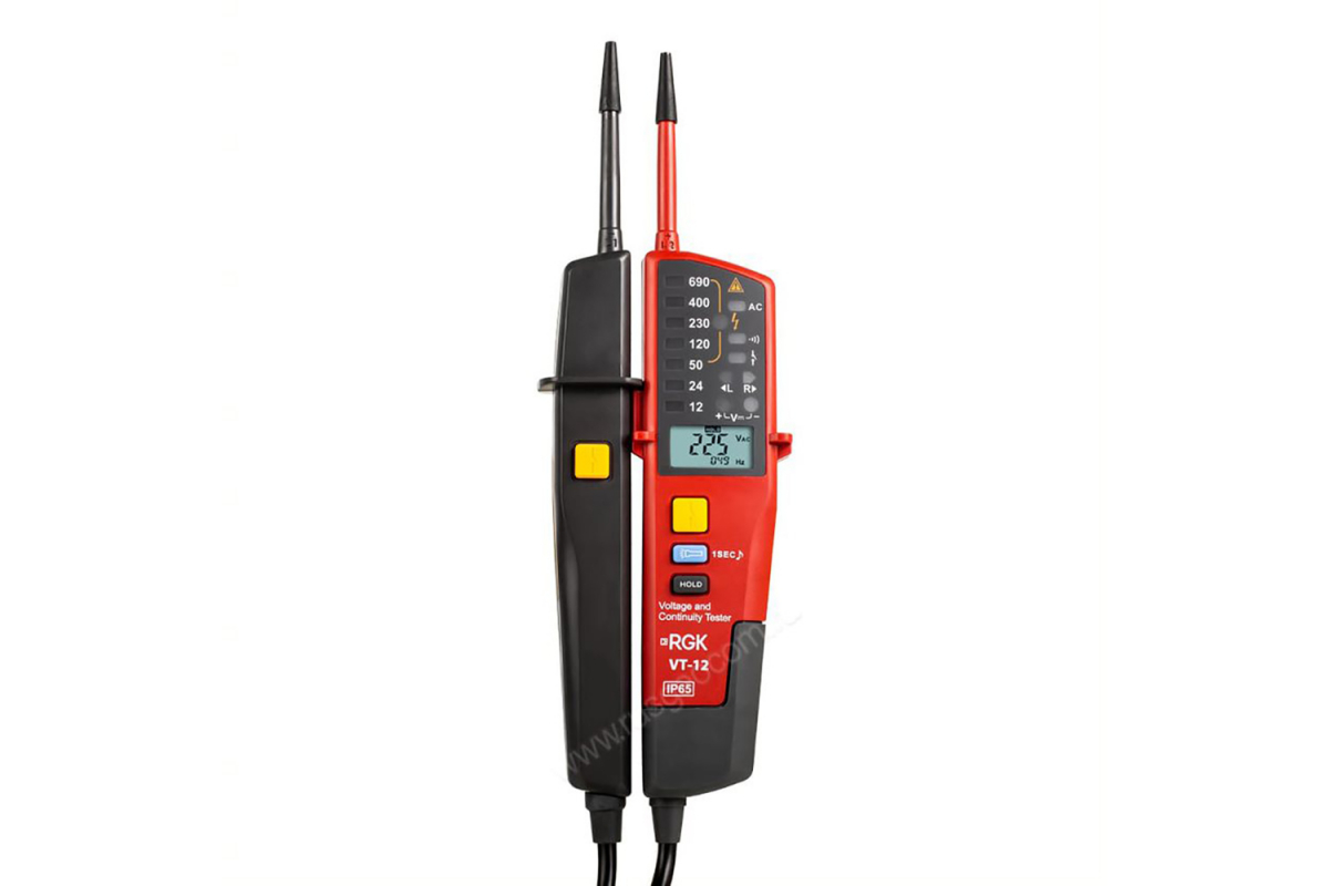 Тестер напряжения RGK VT-12 776547 можно использовать для проверки проводов, розеток, а также УЗО. Инструмент работает в режиме тестирования ноль-фаза.