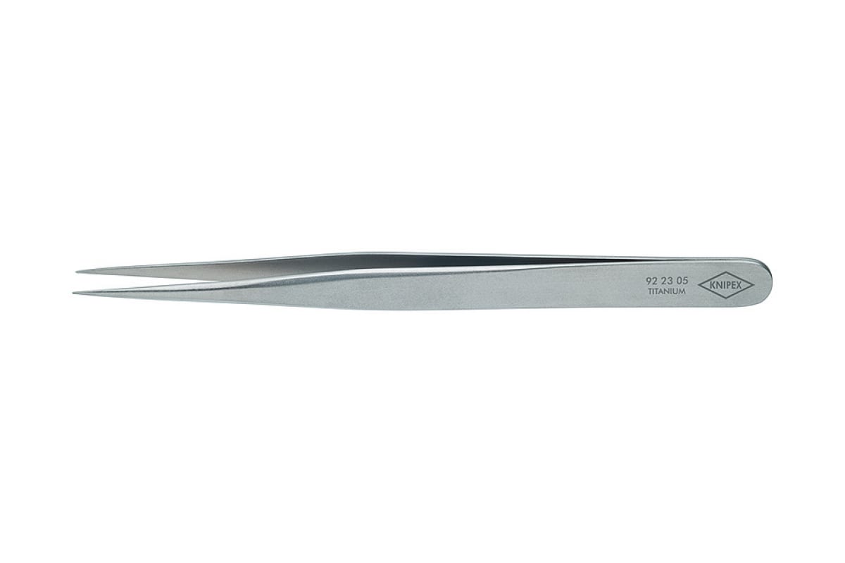 Прецизионный пинцет KNIPEX KN-922305 с особо тонкими губками предназначен для проведения монтажных работ. Немагнитная пружинная сталь, из которой выполнен инструмент, обладает высокой устойчивостью к коррозии. Финишная отделка - титановое покрытие, придающее поверхности изделия дополнительную твердость.