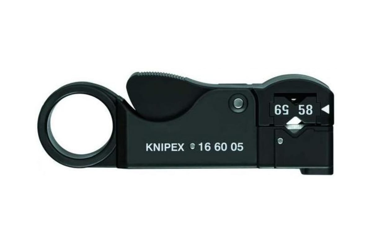 Инструмент для снятия изоляции с коаксиальных кабелей KNIPEX KN-166005SB предназначен для работы с кабелями типа RG 58, RG 59, RG 62. Он удаляет наружную оболочку, экран и изоляцию в один рабочий ход. Имеются три встроенных ножа,глубина каждого из которых настраивается отдельно угловым шестигранным ключом. Положение режущего лезвия не меняется. Корпус выполнен из противоударного пластика.