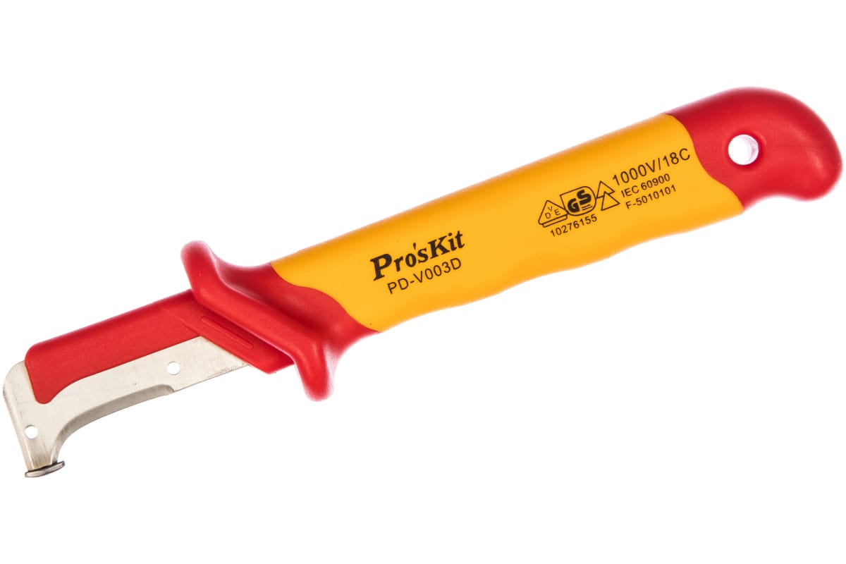 Нож 1000В ProsKit PD-V003D 00321649 - практичный инструмент для работы электрика. Изделие обеспечивает высокое качество среза для круглых кабелей и проводов с секторными жилами.