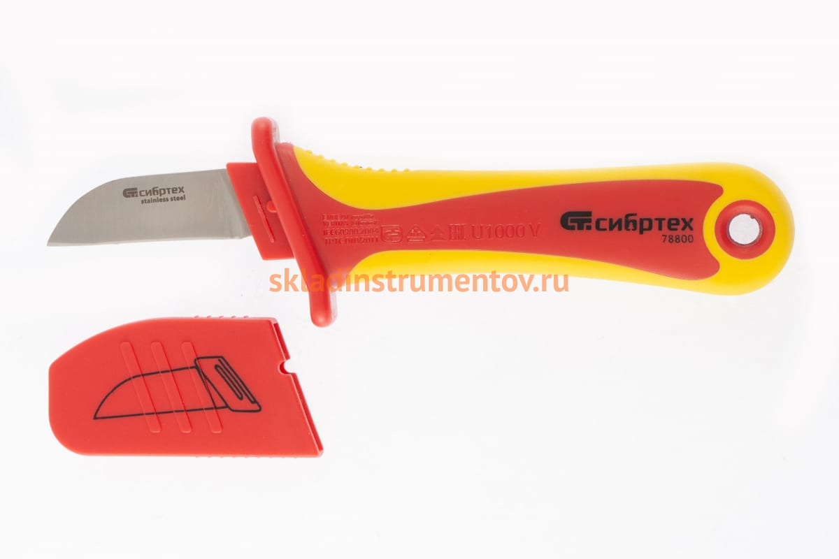 Диэлектрический нож, прямая рабочая кромка полотна СИБРТЕХ 78800 используется при электромонтажных работах. Предназначен для снятия оплетки электрокабелей.