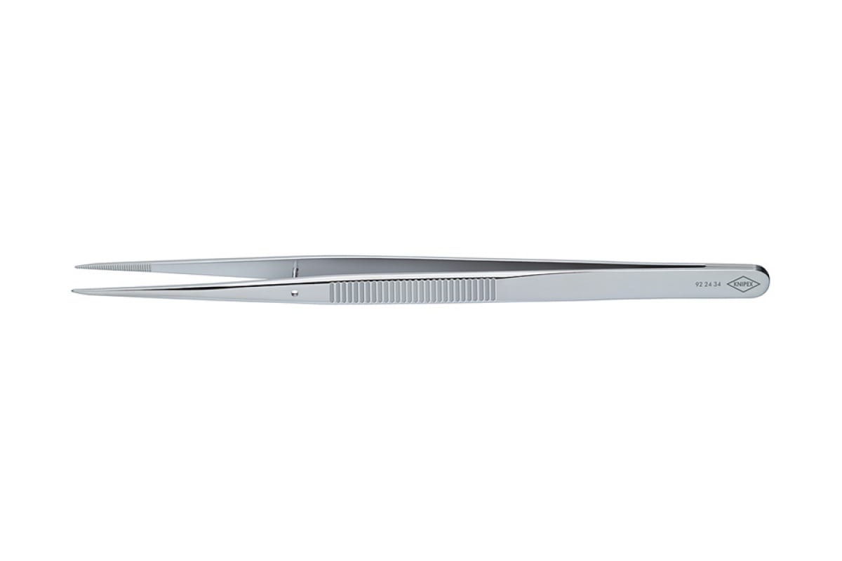 Прецизионный пинцет Knipex KN-922434 - это инструмент прямой формы, который имеет универсальное применение. Он позволяет легко зацепить деталь, поскольку имеет тонкие кончики и захватные губки с мелкими зубцами. Инструмент легко хранить благодаря его компактности и малому весу.