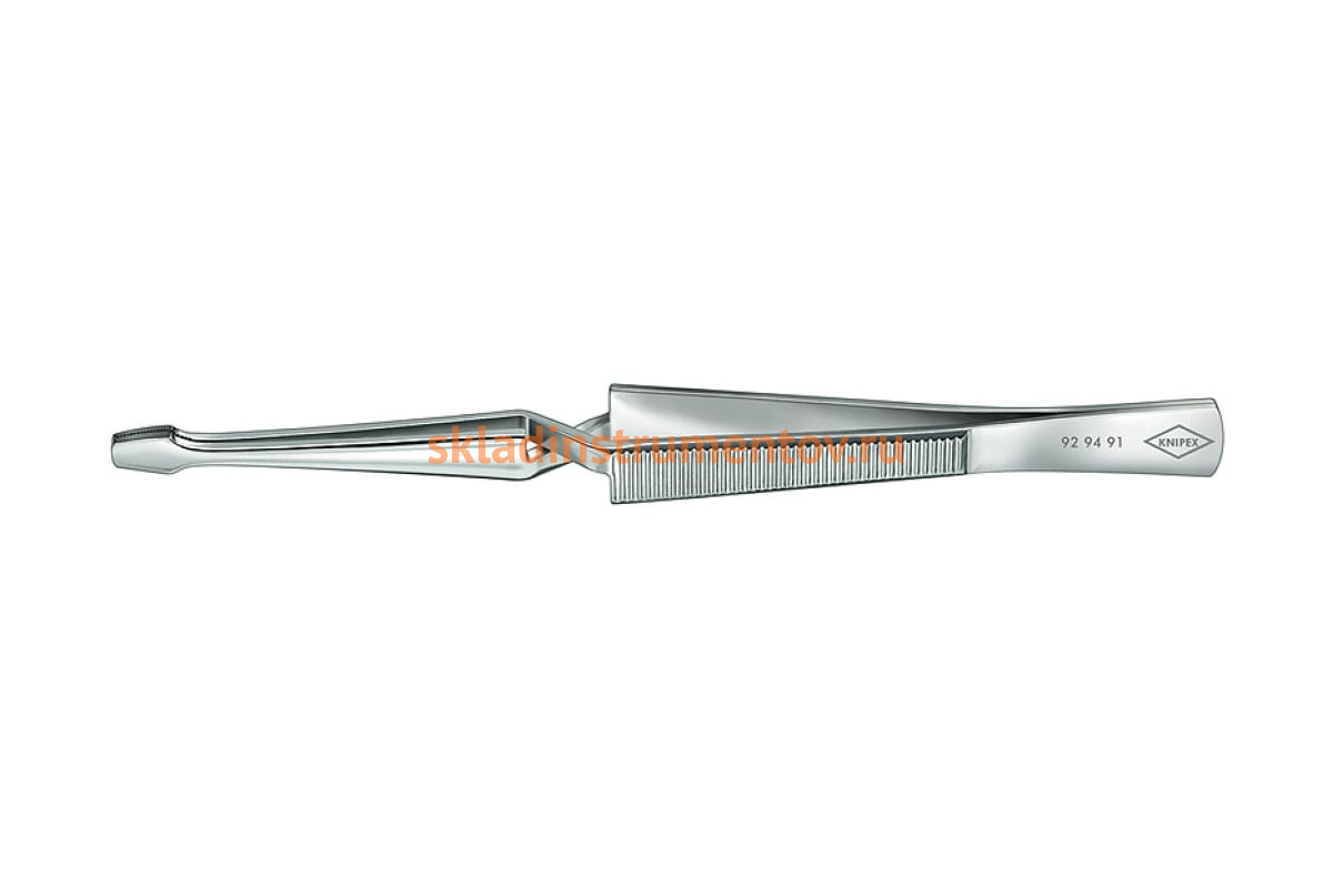 Прецизионный пинцет с перекрещивающимися губками KNIPEX KN-929491 позволяет удерживать детали без применения усилий. Наконечники трапециевидной формы имеют мелкую насечку, что обеспечивает уверенный захват детали. Никелированный корпус изделия устойчив к коррозии.