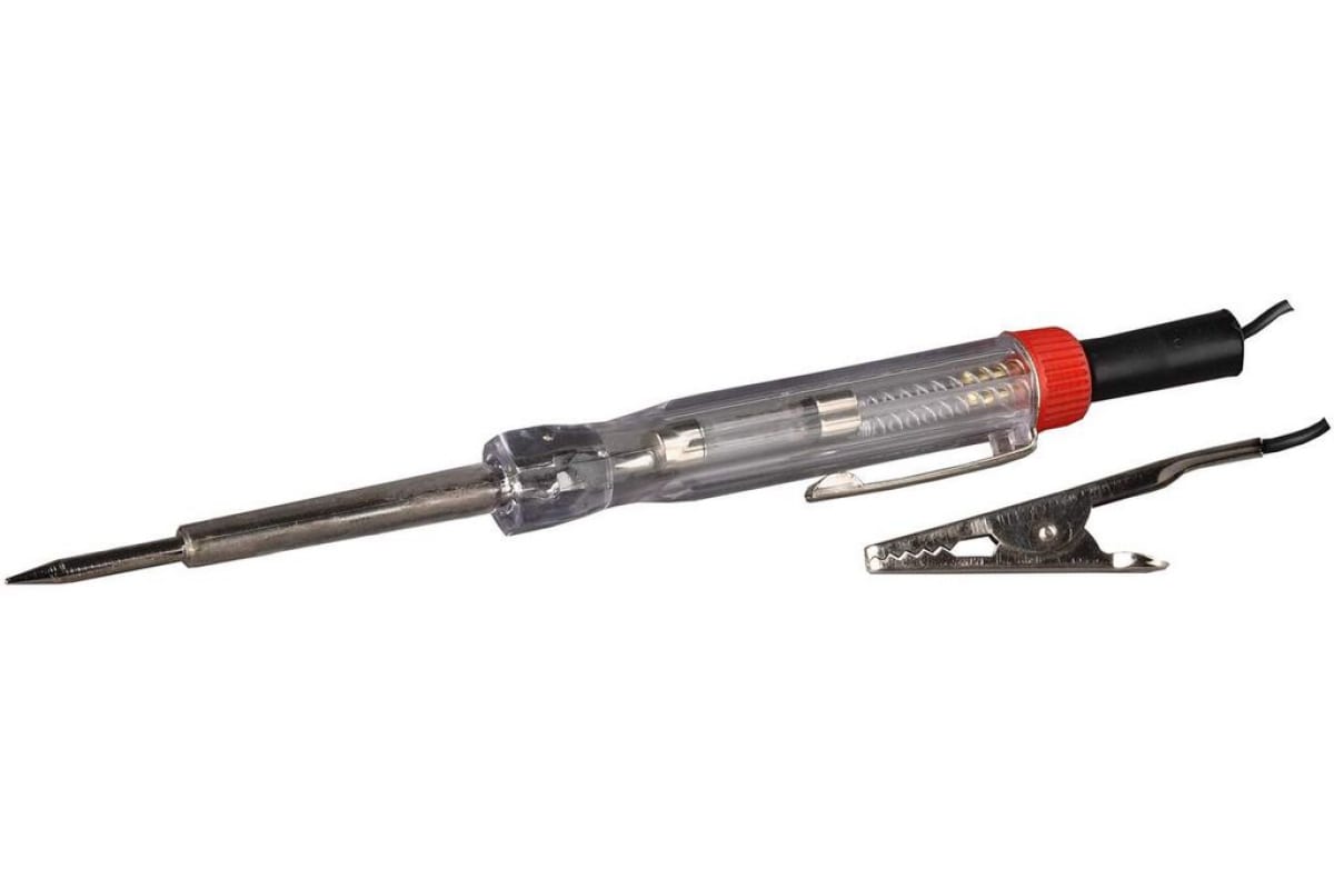 Электрический пробник для автопроводки, 6-24В, 120мм ТЕВТОН 2573-24V используется для контроля напряжения бортовой сети автомобиля, однако, благодаря съемному зажиму его можно использовать и как классический пробник. Корпус изготовлен из пластика, жало выполнено в форме конуса. Инструмент оснащен индикатором, который загорается, если напряжение в сети составляет 6-24В.