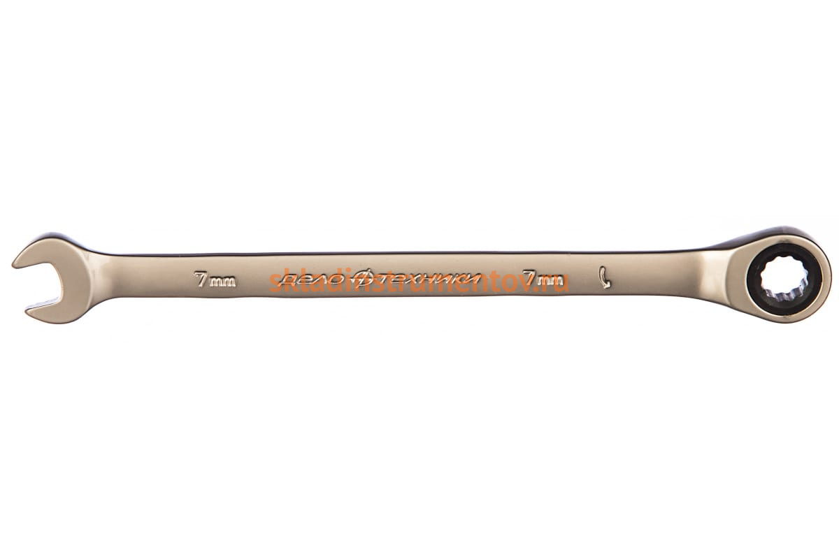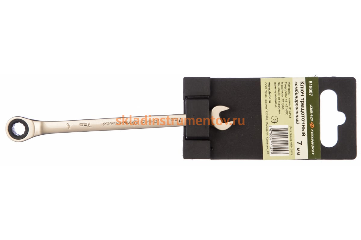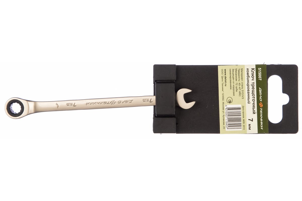 Комбинированный трещоточный ключ 7 мм ДТ 200/5 Дело Техники 515007 используется в качестве ручного инструмента во время монтажа или демонтажа резьбовых соединений. Корпус изготовлен из хромванадиевой стали, которая обеспечивает долговечность и прочность применения. Ключ состоит из рожковой головки и трещоточного 72-зубцового механизма.