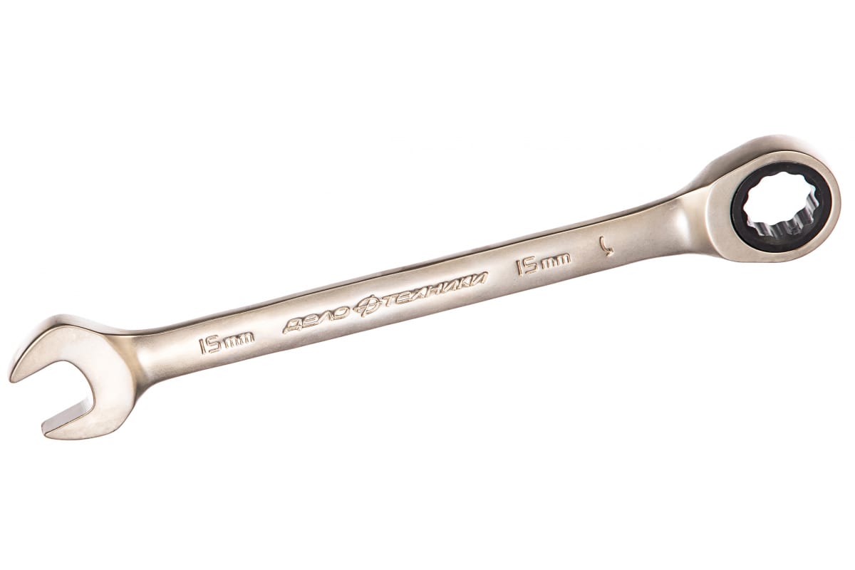Комбинированный трещоточный ключ 15 мм ДТ 100/5 Дело Техники 515015 изготовлен из хромванадиевой стали, которая обладает повышенной твердостью и стойкостью к интенсивным нагрузкам. Инструмент предназначен для работы с крепежом и резьбовыми соединениями. С одной стороны изделия расположена рожковая головка, с другой - трещотка с 72-зубцовым механизмом.