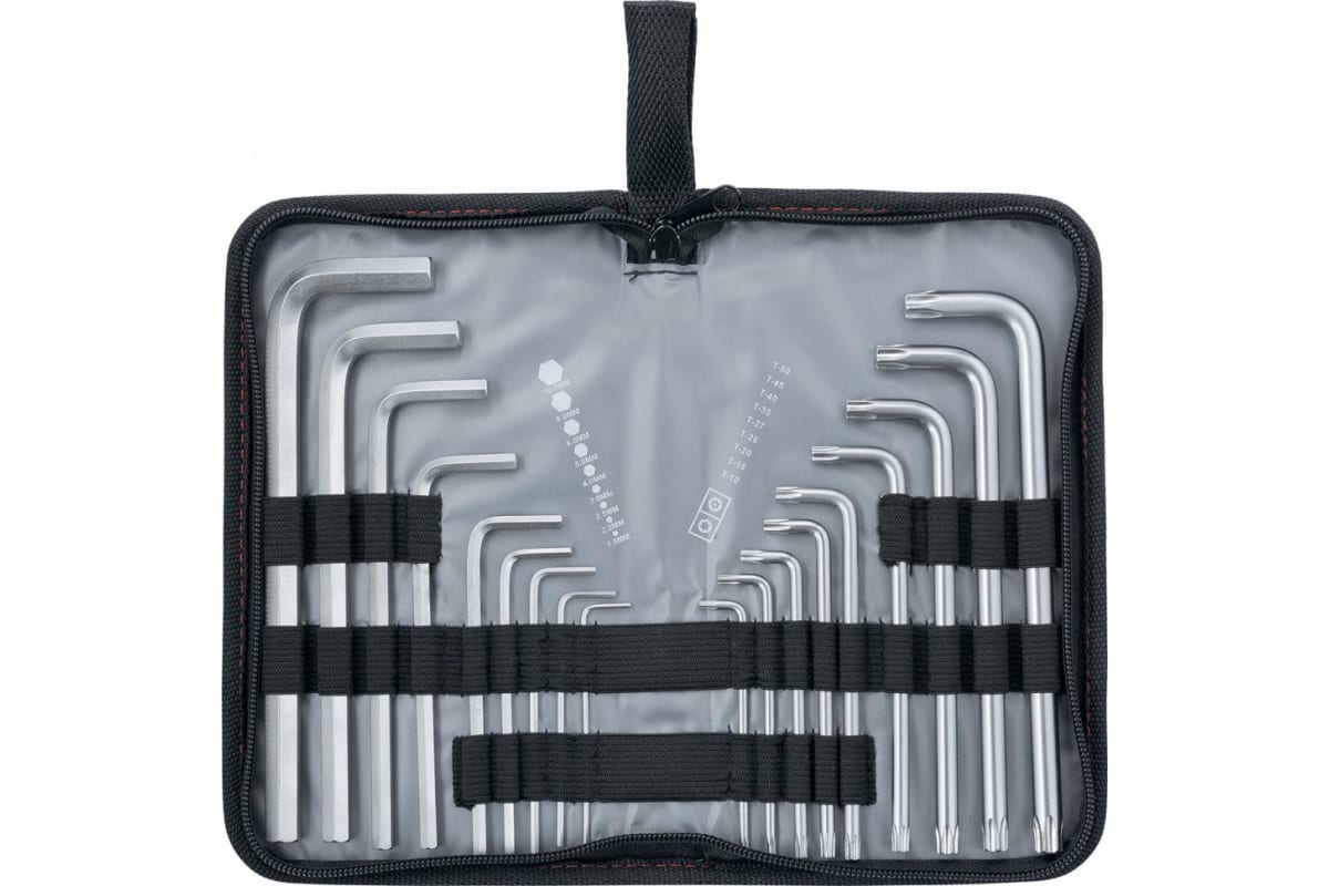 Набор удлиненных имбусовых ключей HEX-TORX, 18шт, HEX 1.5-10мм, T10-T50, CrV, сатин MATRIX 12315 - комплект двусторонних ручных инструментов, позволяющих выполнять крепежные работы с двумя типами винтов: имеющими внутренний профиль в виде звездочки TORX и обыкновенного шестигранника HEX. Ключи имеют удобную изогнутую форму. Выполнены из хромованадиевой стали, твердость соответствует 50 HRС. Дополнительно предусмотрено сатинирование поверхностей. Для удобства хранения и транспортировки в комплекте представлен чехол на молнии.