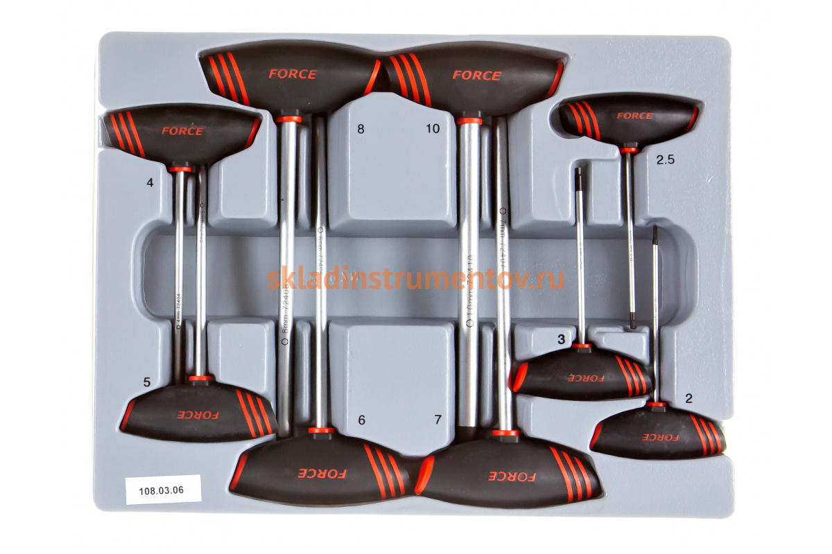 Набор 6-гранных, торцевых ключей с Т-образной ручкой 9 предметов FORCE 2097 охватывает несколько типовых размеров, что значительно упрощает работу с крепежом.