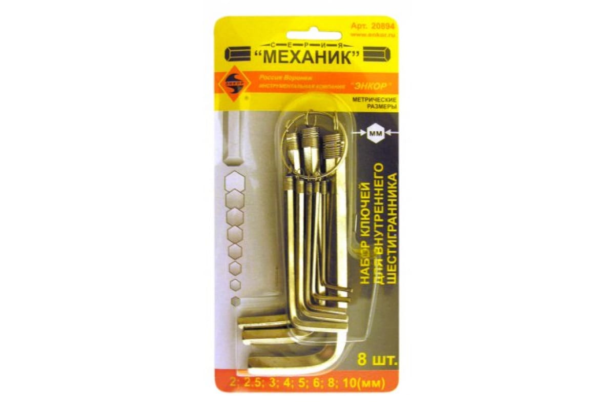 Набор шестигранников 8шт Энкор 20894 применяется при ремонтных работах для крепежных соединений, имеющих шестигранный профиль. В комплект входят 8 Г-образных ключей, закрепленных на кольце, различных размеров - 2; 2.5; 3; 4; 5; 6; 8; 10 мм, упакованных в блистер.
