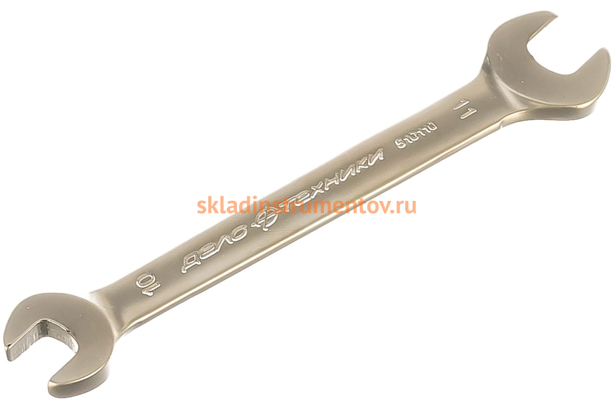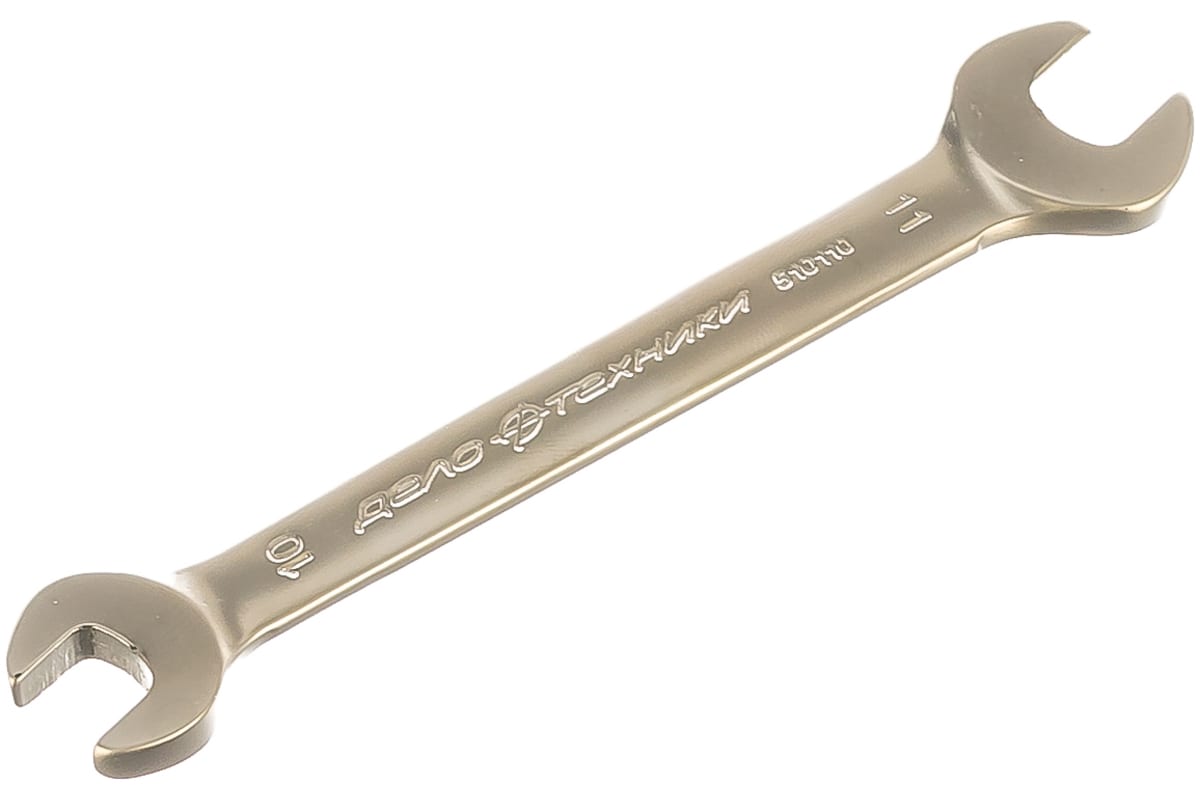 Рожковый ключ 10х11мм ДТ/300 Дело Техники 510110 имеет двустороннее применение - открытые зевы обладают различными размерами, для возможности выполнения расширенных крепежных работ. Инструмент выполнен из прочной стали, прослужит долгий срок даже при частом использовании.