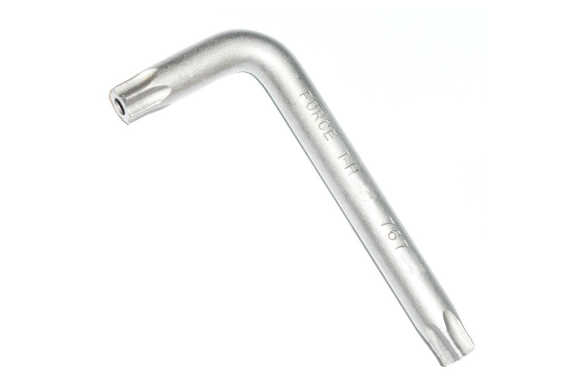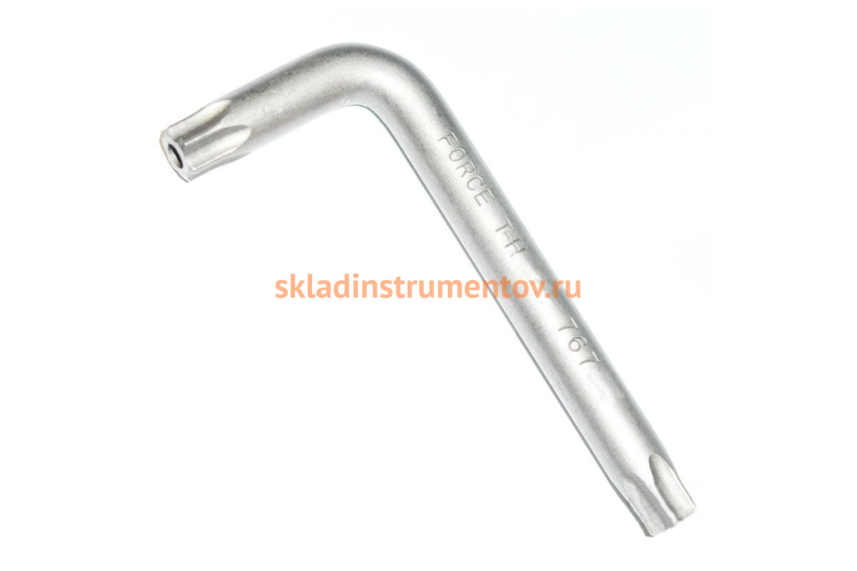 Г-образный ключ с отверстием FORCE Т-27Н 76727 представляет собой изделие для снятия и установки винтов с внутренним антивандальным Torx. Изделие выглядит как Г-образный стержень с отверстием. Ключ выполнен из прочной стали, которая обладает стойкостью к нагрузкам.