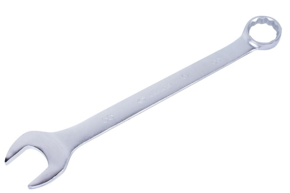 Комбинированный ключ KING TONY 55 мм 1071-55 используется в автосервисах, автомастерских и т.д. Инструментальная легированная хром-ванадиевая сталь специального сплава увеличивает рабочий ресурс инструмента. Хромированное покрытие защищает от коррозии. Наличие двух головок разного профиля расширяют сферу применения. Благодаря специальному изгибу в 15 градусов, можно работать в ограниченном пространстве.