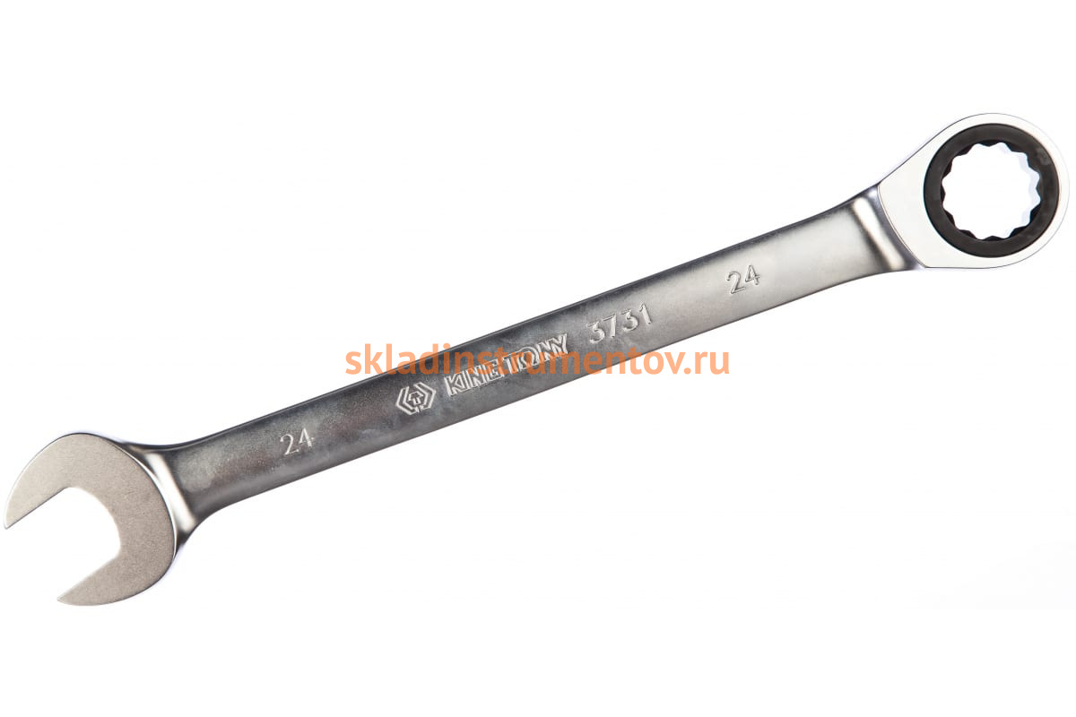 Трещоточный комбинированный ключ 24мм KING TONY 373124M - гаечный инструмент для ручной затяжки и откручивания резьбовых соединений. Инструмент имеет два типа рабочих частей - рожковую и накидную. Накидная головка имеет встроенную трещотку, за счет чего рабочий процесс происходит в разы быстрее, так как нет необходимости постоянно переставлять ключ на крепеже.