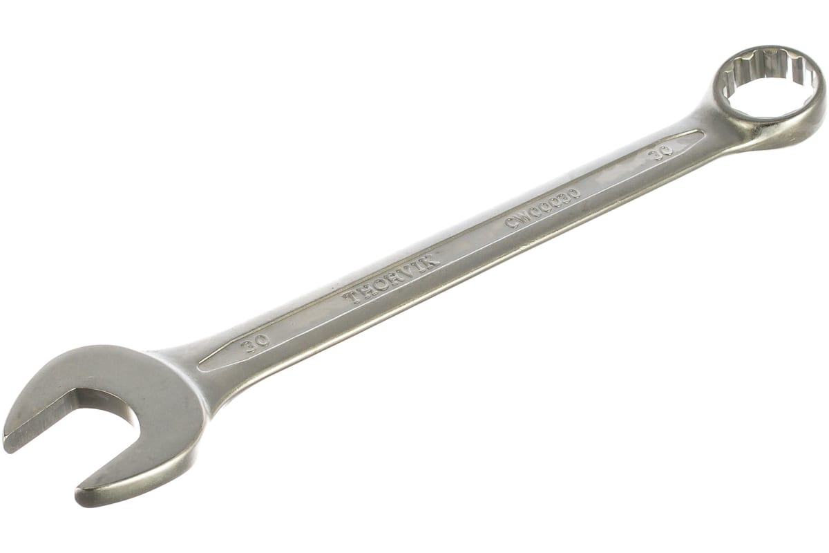 Комбинированный ключ THORVIK CW00030 30 мм 52043 выполнен из хромованадиевой стали с хромоникелевым покрытием. Он имеет двухстороннюю конструкцию, сочетающую в себе преимущества рожкового и накидного ключей. Данный инструмент предназначен для монтажа и демонтажа резьбовых соединений, имеющих шестигранный профиль. Благодаря кольцевому зеву, оснащенному 12-ю гранями, снижен риск деформации крепежа.