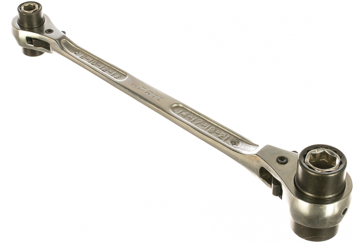 Торцевой комбинированный трещоточный реверсивный ключ HORTZ 8х10-12х13-14х17-19х21 HOR 121268 охватывает несколько размеров, которые оптимальны для шестигранного крепежа. Это позволяет использовать единственный ключ во время сборки мебели или проведения ремонтных работ.