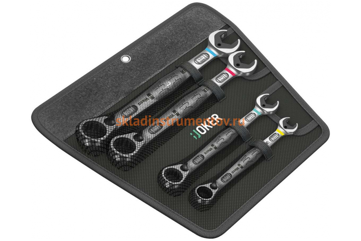 Набор комбинированных ключей с трещоткой, WERA 6001 Joker Switch 4 Set 1 10/13/17/19 мм, 4 предметов WE-020090 с нагнутой на 15 градусов рожковой частью для лучшего захвата частично закрытой гайки.