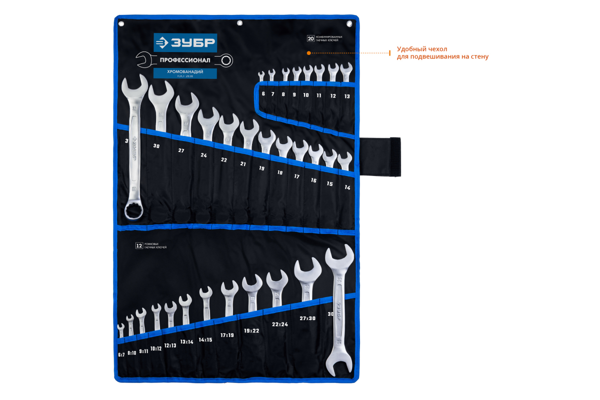 Набор комбинированных и рожковых гаечных ключей ПРОФ Зубр 27086-H32 значительно упрощает работу с крепежом.