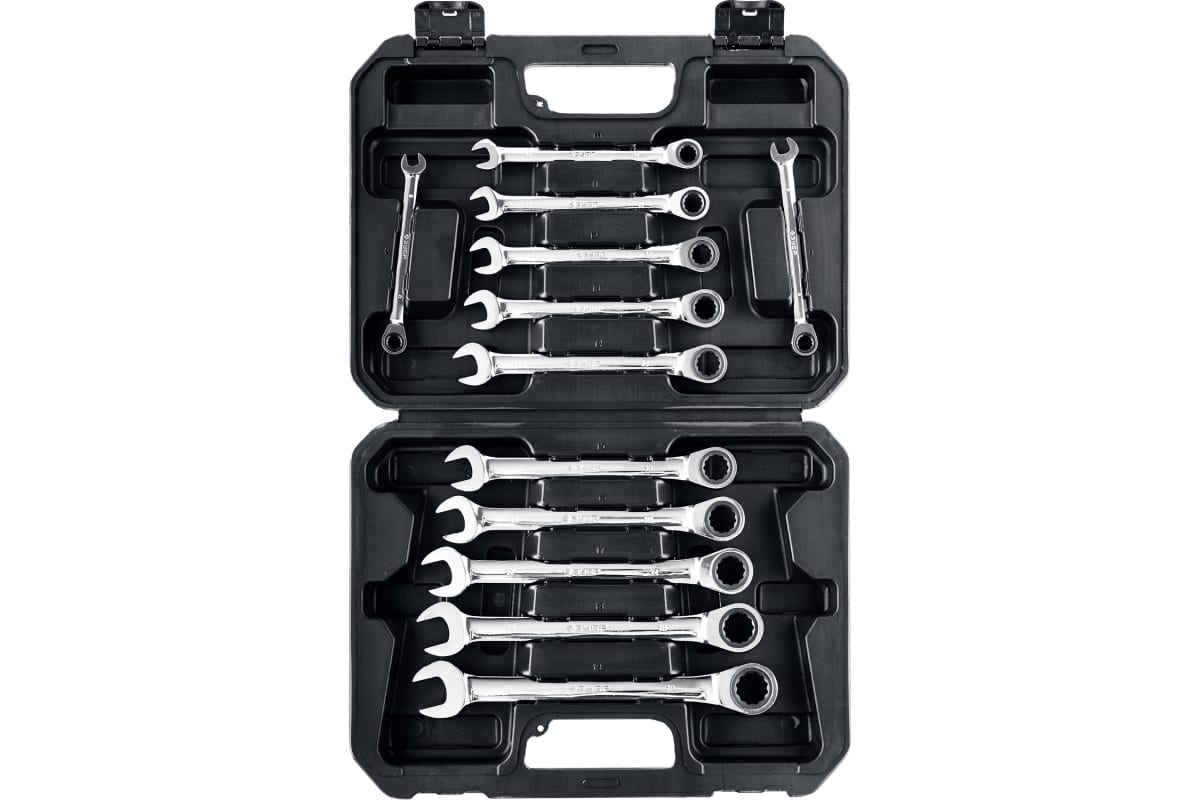 Набор комбинированных гаечных ключей трещоточных Зубр ПРОФЕССИОНАЛ 27073-H12 значительно упрощает работу с крепежом.
