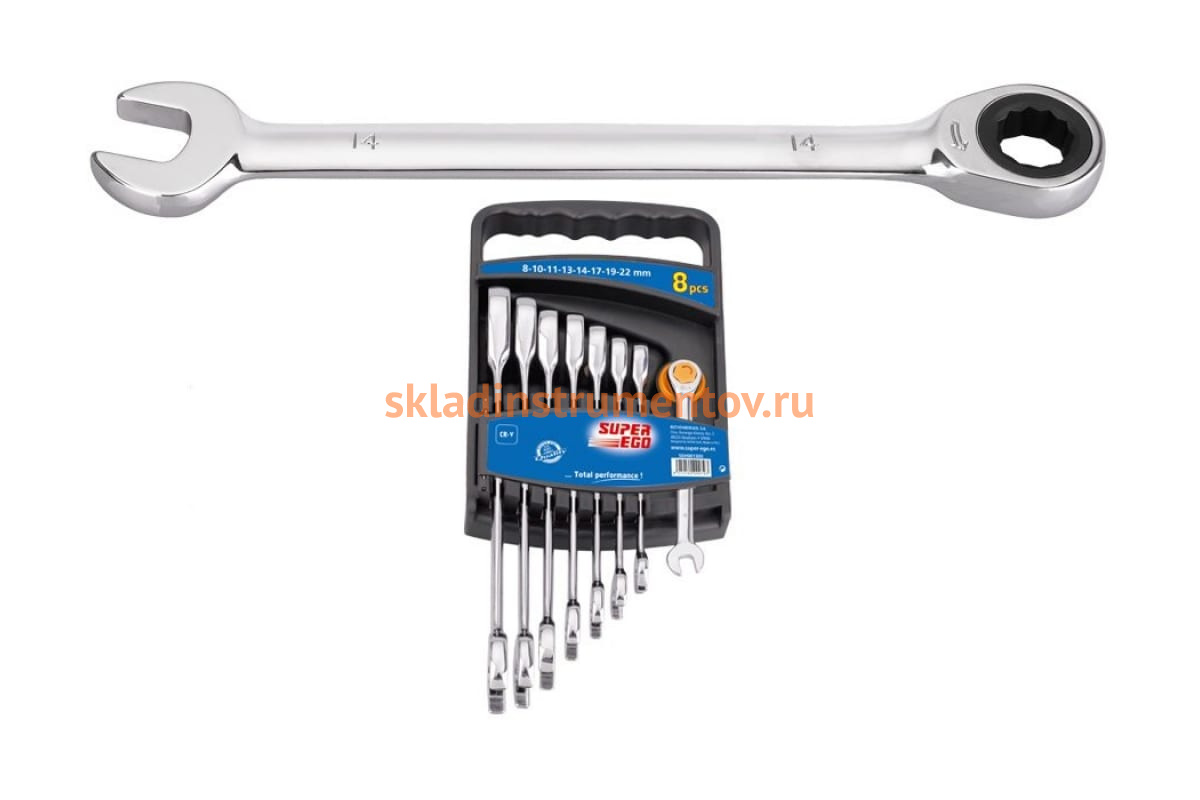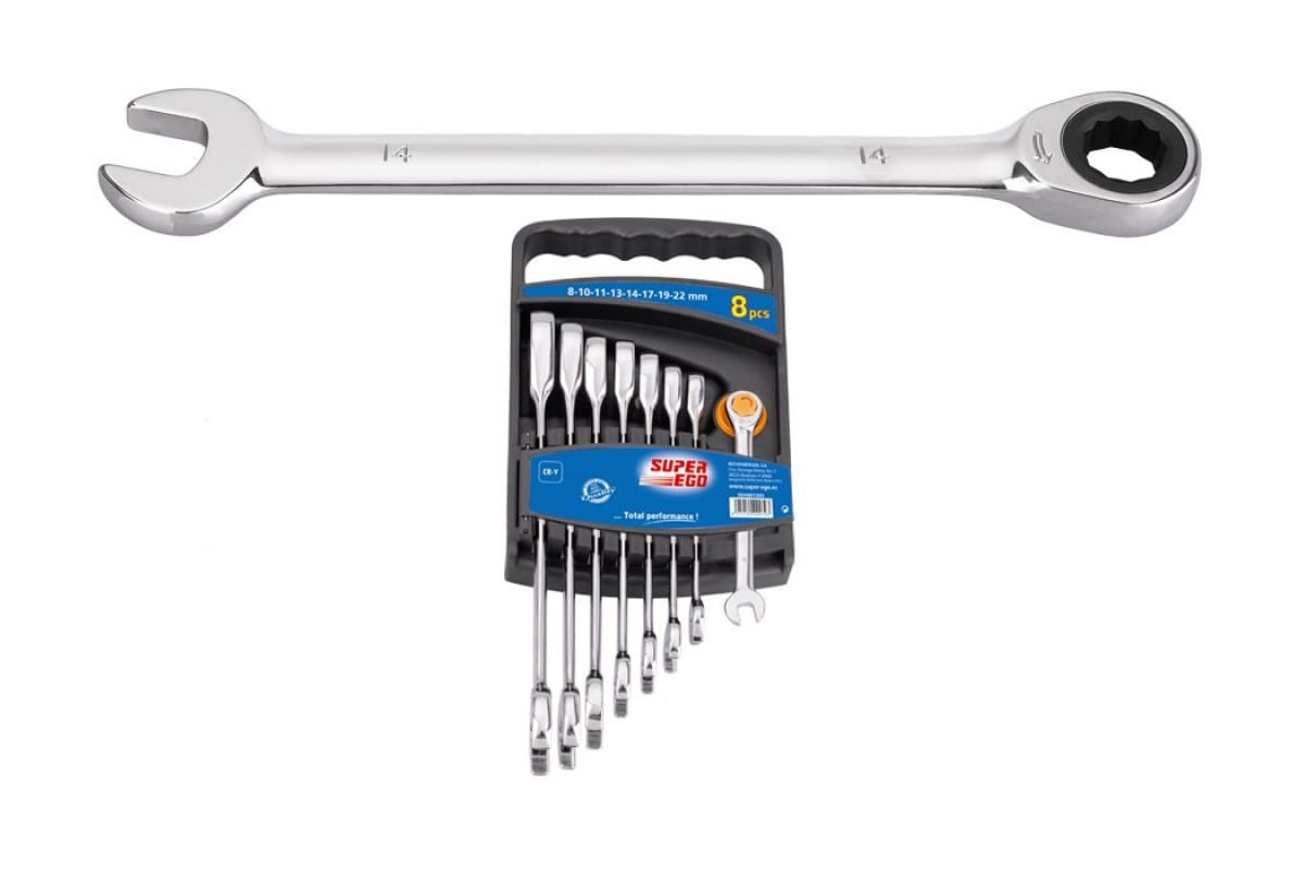Набор комбинированных рожково-накидных ключей с трещоткой SUPER-EGO SEH001300 - комплект из восьми двусторонних ручных инструментов для выполнения работ с болтами и гайками шестигранного профиля.