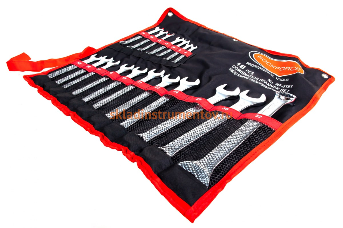 Набор комбинированных ключей 8-32мм 18 предметов на полотне ROCKFORCE RF-5281 позволяет работать с крепежом с различной степенью доступности.