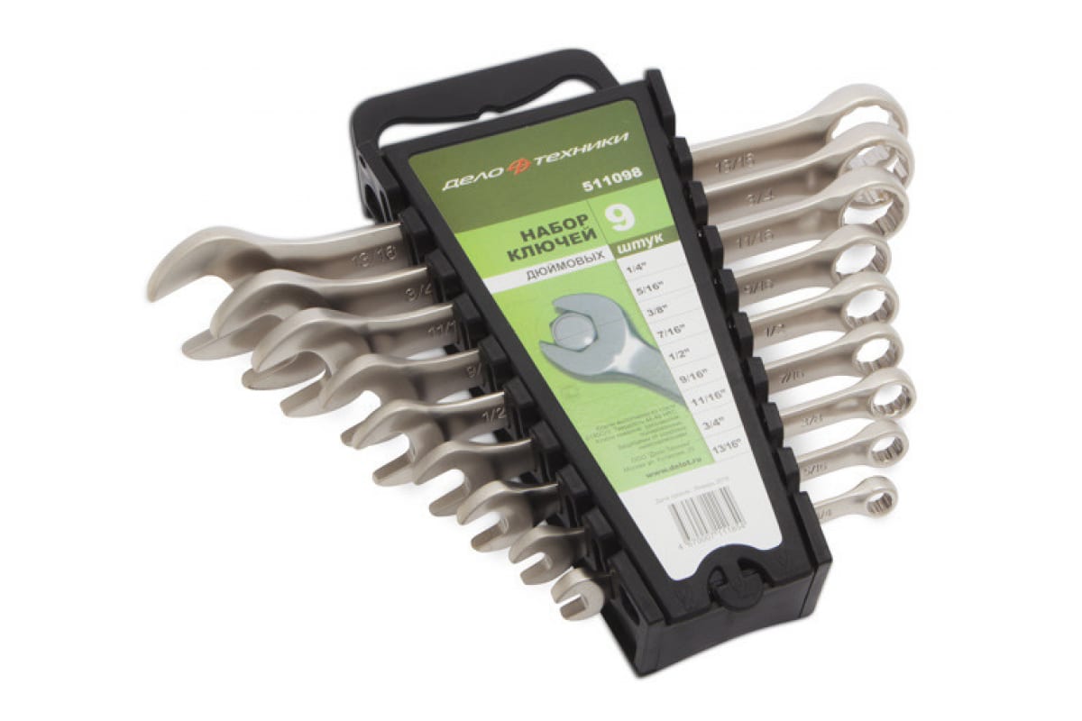 Набор комбинированных дюймовых ключей 9 шт холдер ДТ/10 Дело Техники 511098 является простым и практичным комплектом ручного инструмента, используемого в гараже, автомастерской, при ремонтных работах. Ключи изготовлены из хромванадиевой стали, которая обладает повышенной износостойкостью и прочностью. Каждое изделие имеет рожковую и накидную головки, которые обеспечивают высокий крутящий момент.