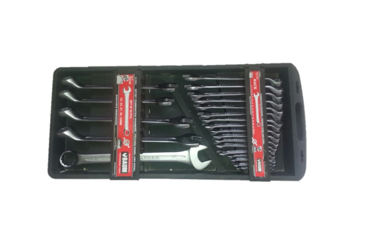 Набор комбинированных ключей BAUM 75 градусов, в пластиковом держателе, 22 предмета 40-22МР - имеет сразу 2 варианта рабочих поверхностей и предназначены для проведения работ с крепежными изделиями, имеющими стандартный внешний 2-12-гранный профиль.