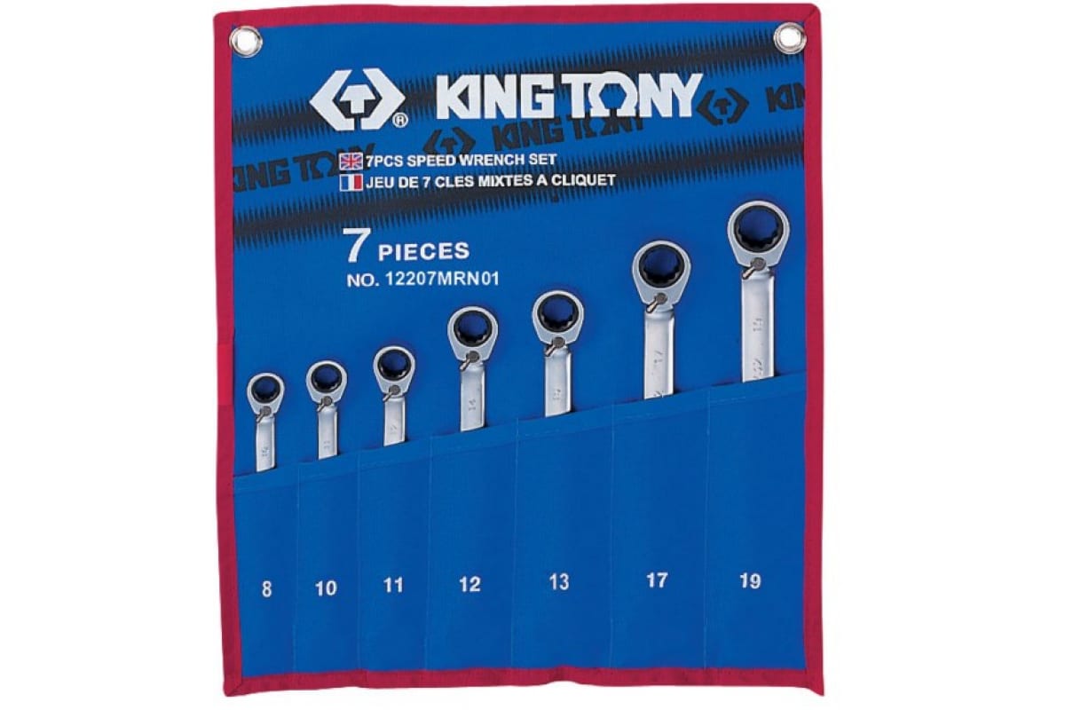 Набор комбинированных трещоточных ключей в чехле из теторона (8-19 мм, 7 предметов) KING TONY 12207MRN01 - прочный ручной инструмент профессионального класса. Каждый из ключей хранится в отдельном отсеке чехла. Отверстия позволяют размещать чехол на стенде или инструментальной тележке.