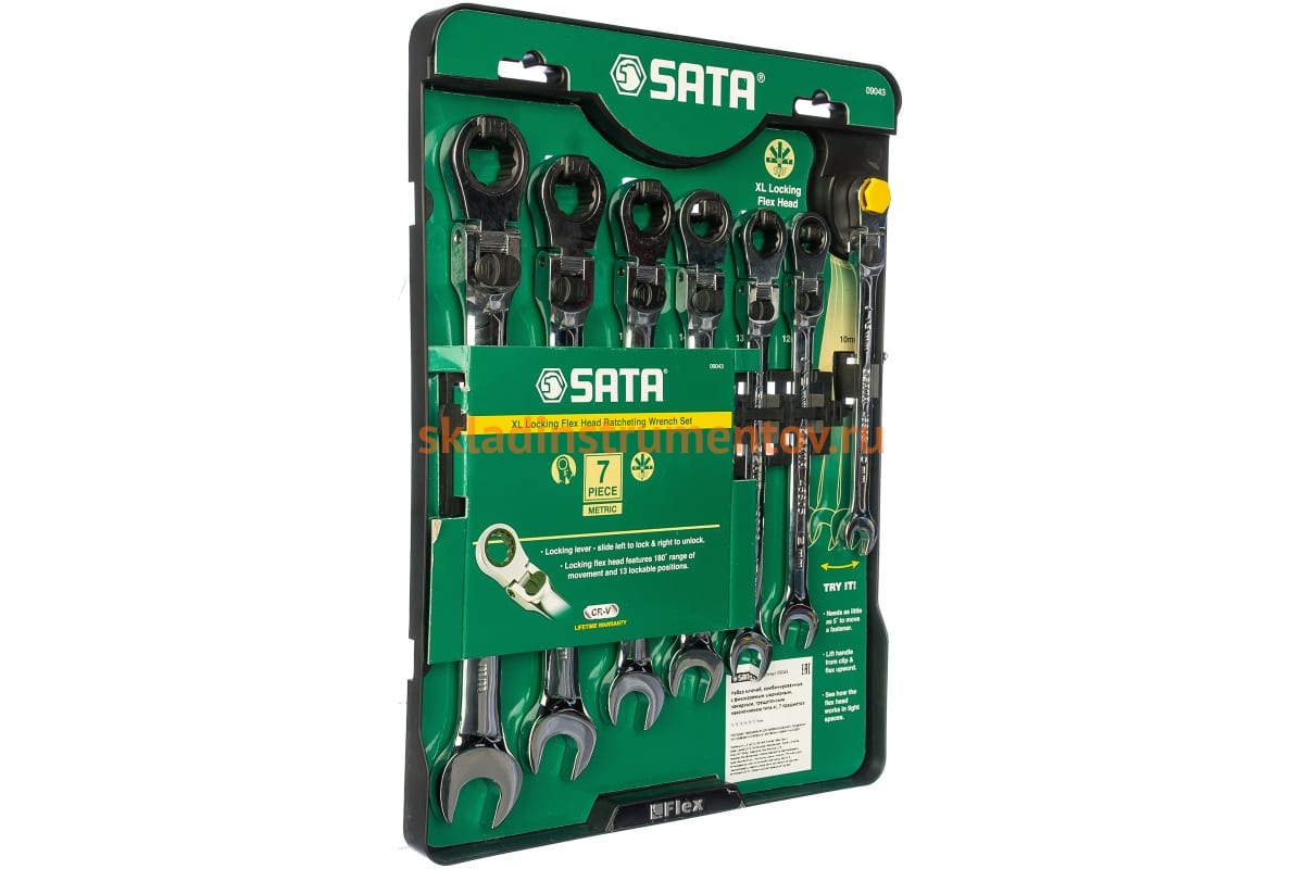 Набор ключей с наконечником типа XL Sata 7 предметов 09043 включает в себя инструменты с двумя головками. Каждый ключ изготовлен из хромованадиевой стали. Рожковый профиль имеет уникальную запатентованную форму для максимально плотного захвата крепежного элемента. Второй накидной профиль оснащен шарнирным механизмом с фиксацией, который позволяет использовать инструмент в труднодоступных местах. Набор расположен в удобном чехле, он обеспечивает комфортное хранения и может быть подвешен на крючки.