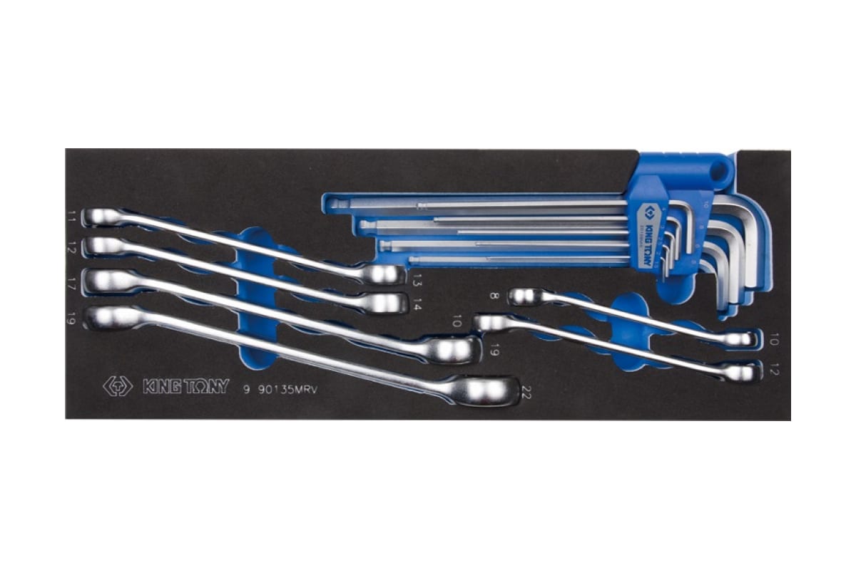 Набор разрезных ключей и шестигранники Г-образные, ложемент, 15шт KING TONY 9-90135MRV включает в себя все необходимые ручные инструменты распространенных размеров для возможности выполнения быстрой и качественной работы по ремонту и обслуживанию автомобилей и других различных устройств и агрегатов. Разрезные ключи подходят для гаек, расположенных на трубках, длинных шпильках и пр. Угловые ключи служат для откручивания/закручивания винтов с внутренним шестигранным профилем. Ложемент выполнен из материала EVA (ЭВА, этиленвинилацетат) - легок и прочен, устойчив к маслам и растворителям, при деформации восстанавливает прежнюю форму. Набор разработан специально для комплектации инструментальной тележки.