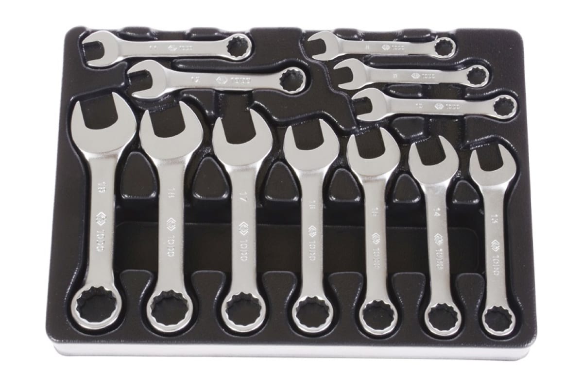 Набор укороченных комбинированных ключей 12шт KING TONY 9-1282MR предназначается для выполнения ремонтно-сборочных работ для монтажа или демонтажа крепежных узлов при обслуживании различных конструкций, механизмов и агрегатов. Особая геометрия инструментов обеспечивает возможность их применения в условиях ограниченного пространства. Ключи располагаются на специальном ложементе из ПВХ, который используется для укомплектовывания инструментальных тележек.