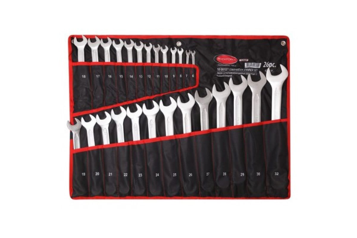 Набор ключей комбинированных 15грд., 26 предметов 6-30, 32мм, на полотне ROCKFORCE RF-5266P позволяет работать с крепежом с различной степенью доступности.
